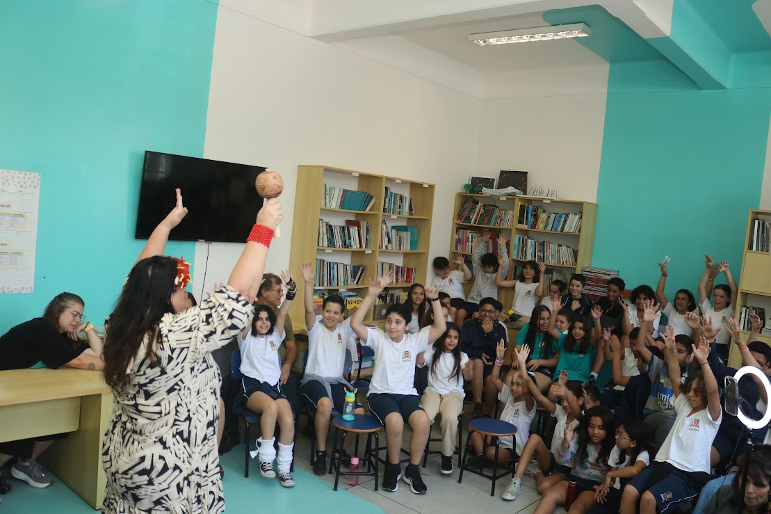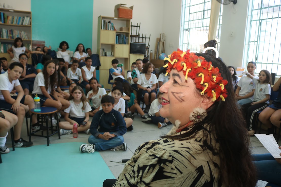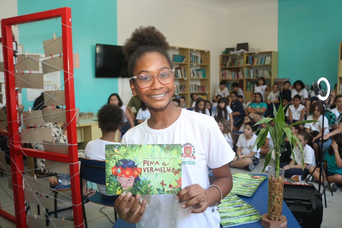Alunos dos 5º anos da UME Cidade de Santos, no Embaré, viveram uma manhã cultural nesta quarta-feira (19), ao receber a escritora Vanessa Guarani Ratton, autora do livro Pena Vermelha, obra trabalhada pelos estudantes no Projeto Porto de Literatura.